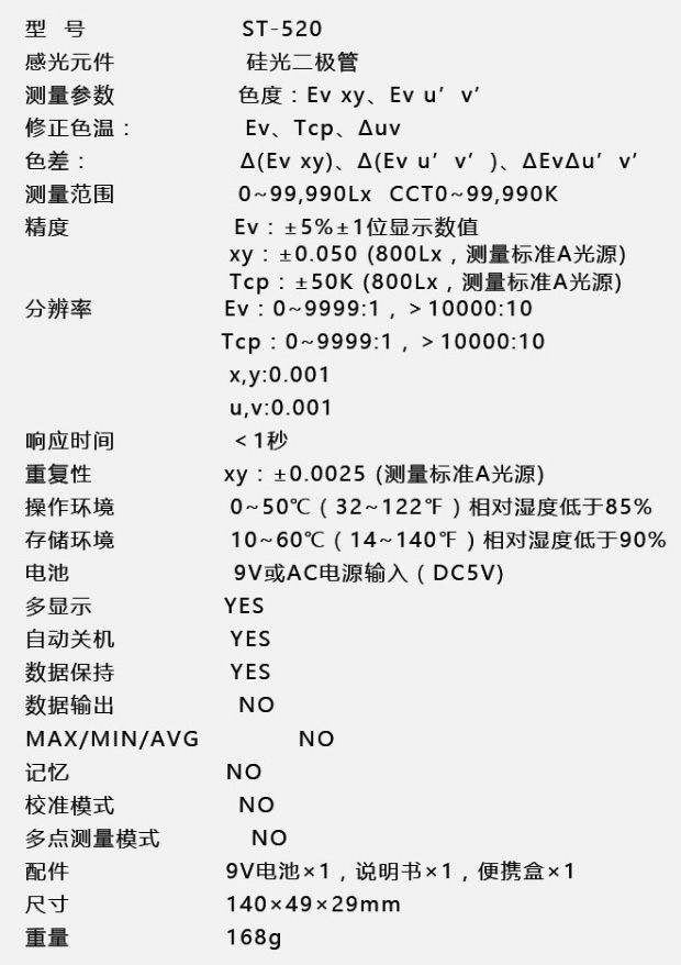 應用彩色LED燈、商業(yè)顯示、電影電視、投影室、倉庫、藝術館、博物館、學校、劇院、圖書館、體育館、競技場ST-520色溫照度計詳細資料特性精密儀器用于測量光照度符合CIE明視光譜響應數(shù)據(jù)保持快速響應。